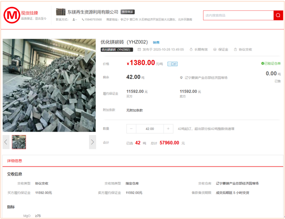 东北亚镁质材料交易中心(以下简称“东镁中心”)是全国唯一的镁质材料专业交易平台,东镁中心是东镁再生资源的战略合作单位,东镁再生资源所有废旧耐火材料都将通过东镁中心现货交易平台进行“电子仓单+挂牌交易”。东镁中心作为独立第三方,对废旧耐材的收购、仓储、交易全过程实施严格监管,确保流程规范、价格公开透明。整个流程中产生的合同、资金流等关键数据均由平台实时记录并全程留痕,并同步到税务部门,实现商流、资金流和发票流合一并可追溯、可核查。相关交易数据由东镁中心进行保存,用于相关部门实时监督与事后审计,从机制上防范虚开风险,保障交易的公平公正,信息公开透明,也便于监管部门的实时监控,保障政府及税务部门监管无死角。同时东镁中心通过大量数据整合资源,有效解决双方信息不对称的问题;还通过规范的第三方仓储监管,将废旧耐材转化为标准化仓单,可进行仓单质押融资和其他供应链金融相关服务;还定期发布市场供需动态、价格走势、技术创新等信息,同时规范的交易流程和系统管理,给行业和企业进行技术和信息赋能。通过东镁中心的全方位赋能,能够为废旧耐材行业的规模化、标准化和高值化发展提供重要支撑。